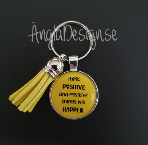 Nyckelring med texten ”Think positive and positive things will happen”. Finns i färgerna gult, grönt, turkos, cerise och lila.